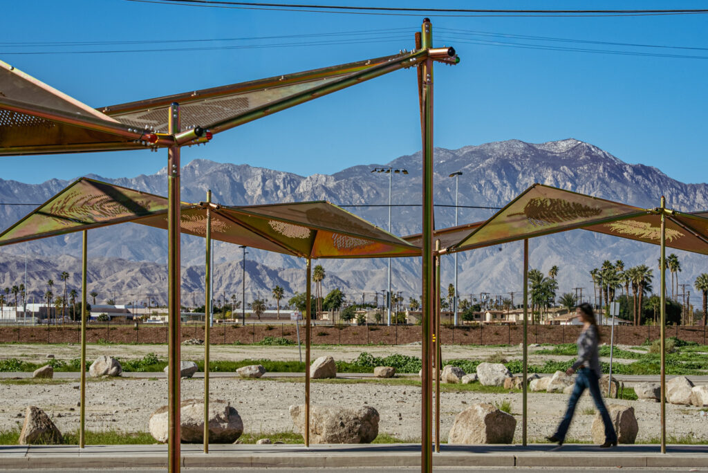 Derived from Indio’s history with date palms, this ¾ mile shade structure on Jackson St. joins the new CV Link to the new park. Local school children drew shadows of palms & we translated those drawings onto perforated shadow-casting panels. An undulating structure reflects the surrounding mountains.